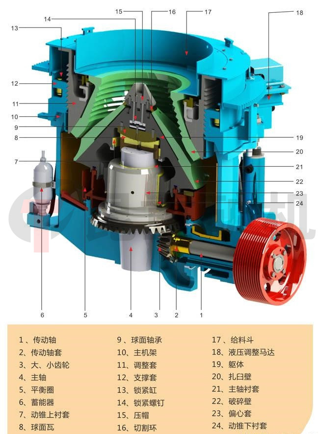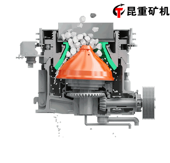 多缸液壓圓錐破碎機的(de)破碎過程是在定錐襯板和偏(piān)心運動的動錐襯(chèn)板(bǎn)之間完成的。電(diàn)機通(tōng)過三角皮帶和皮帶輪來驅動(dòng)破碎機的(de)水平軸,水平軸通過齒輪傳(chuán)動來驅動偏心套旋轉。偏心套帶動主軸使(shǐ)動錐部成旋擺運動,從而(ér)在偏心擺動的動錐襯板(bǎn)和定錐襯板之間(jiān)產生周期(qī)性的相對運(yùn)動,使待破碎物料在破碎腔內不斷地受到擠壓和彎曲而被破碎。待破碎物料由上部的給料口進入破碎機,破碎後(hòu)的物料由破碎機下部的排(pái)料口排出。