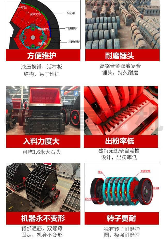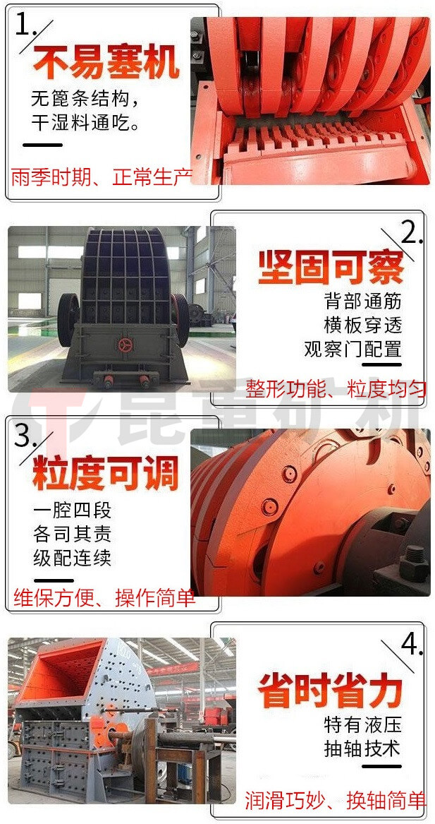 重錘式破碎(suì)機采用無蓖條設計,產量大,無堵塞,出料可調。一破成型替代顎式破碎機與反擊式破碎機的聯合作業(yè)與傳統(tǒng)錘破相比,91香蕉视频app礦機采用獨特無蓖條設(shè)計(jì),通過調整活(huó)動反擊板與轉子上錘頭回轉軌跡圓之間的距離,調整出料粒度的大小,大大降低出粉(fěn)率,揚塵大大減少,更環保實用。進(jìn)料口大具備鄂破可以吃大料功能,同時具備反擊破(pò)整(zhěng)形功能。同時可破碎濕料,下雨天不影響生產,解決了傳統錘破易堵塞、易卡機、產量(liàng)低的難題。