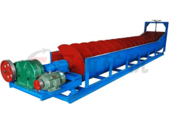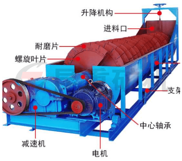 機器(qì)轉子(zǐ)采用中心結構,螺(luó)旋葉片安裝(zhuāng)在中(zhōng)心軸上,有減速機連接到中(zhōng)心軸(zhóu)上進行工作。借助固體(tǐ)顆粒的比重不同,因而在(zài)液體(tǐ)中沉降得速度(dù)不同的原理,進行洗選的設備。物料由給料箱均勻給入,連續給主槽體中注(zhù)入一定(dìng)量的水(shuǐ),傳(chuán)動部帶動螺旋軸以一定的速度旋(xuán)轉(zhuǎn),迫使物(wù)料在槽體中翻轉滾(gǔn)動並向排料口運動,細粒(lì)級物料和雜質隨溢流水經溢流堰排出,粗粒度物料由排料口排出,從而實現物料的洗選、分(fèn)級、除雜和脫水。