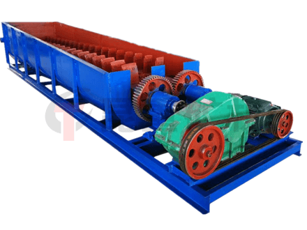 雙軸洗石機的給(gěi)料是從槽體的下端給入,粘結在一起的砂石泥團被洗礦葉片連續的攪拌、擦洗,並受到上端高壓衝洗水的衝洗和鬆散作用,迫使粘性泥土與物料顆粒解離,黏士形成懸浮狀態的礦漿由下部溢流槽排出,粗粒(lì)物料顆粒則受到葉片的推(tuī)動作用(yòng),從洗石機上部(bù)的排(pái)料口排出。